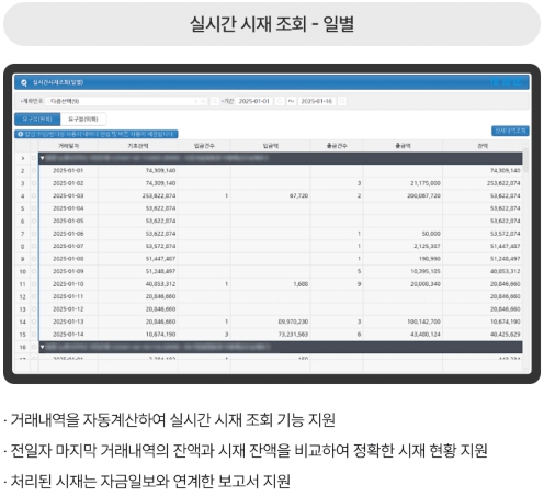 계좌별 시재검증을 통한 회계 시재와 Reconcile지원, 전일자 마지막 거래내역의 잔액과 시재 검증을 통한 정확한 시재 지원